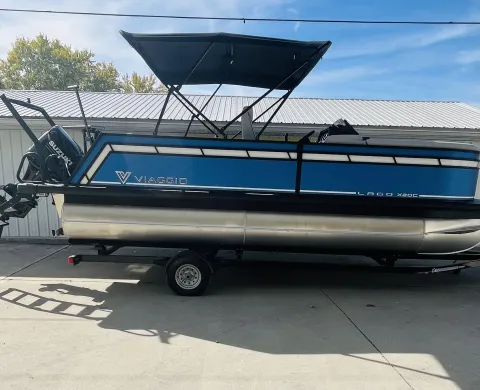 The Viaggio Lago X20C is a bi-toon pontoon boat known for It's design to blend mid-line pricing with a high-end feel. With plenty of storage, diving board, swim ladder, ski bar paired with a 4 stroke Suzuki 140 outboard, that offers full days of fun!